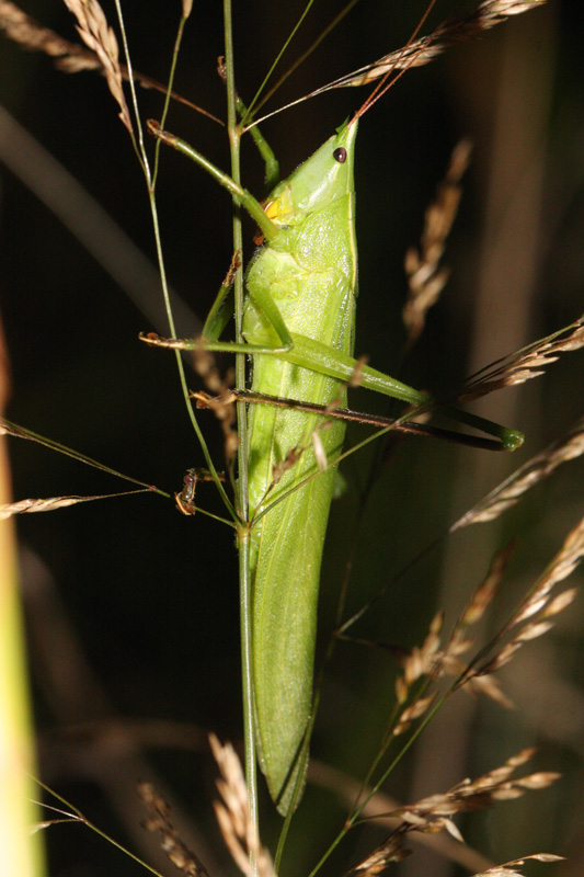 One of the most common species in eastern Pennsylvania is the Sword-bearing Conehead. This species is common in weedy fields where it often sits vertically on a blade of grass or the stem of a plant such as goldenrod. This species can be either green or brown.